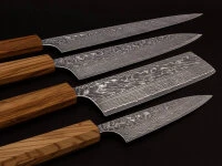 . Die Ummantelung besteht aus Nickel Damast in 62 Lagen, insgesamt hat die Klinge also 63 Lagen. Finish: Optisch wird die Klinge natürlich durch die Damast Lagen dominiert. Um einen zusätzlichen Schutz und ein besonderes Design zu erzielen, sind diese Messer brüniert, was die edle Optik unterstreicht. Griff: Diese Serie bieten wir mit zwei unterschiedlichen Griffen an. Ein Griff ist aus italienischem Olivenholz, gewachst und achteckig (Oktagon) geformt. Der andere Griff ist aus japanischem Quittenholz, achteckig (Oktagon). Beide Griffe vermitteln eine großartige Haptik und liegend hervorragend in der Hand.