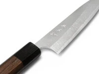 Material: Der blaue Papierstahl ist und bleibt der beliebteste Messerstahl in Japan. Er ist verschleißfester als Shirogami, damit noch schnitthaltiger, bietet eine extrem hohe Härte und ein begeisterndes Schärfepotential. Aogami super ist der Stahl unter den blauen Papierstählen mit den besten Eigenschaften und kann mit etwas Übung so scharf geschliffen werden, wie kaum ein anderer Stahl – rasiermesserscharf. Unsere Messerserie Nashiji von Yoshimi Kato ist mit Aogami super und einer Außenhaut (Ummantelung), fein säuberlich vom Meister Yoshimi Kato, Sohn von Hiroshi Kato, selbst „feuerpoliert“ geschmiedet. Der Stahl der Ummantelung und das Finish Nashiji sehen nicht nur sehr gut aus, sie schützen auch vor Rost, ohne nach europäischem Maßstab rostfrei zu sein. Bei einer üblichen und sorgfältigen Behandlung ist ein Rostbefall nahezu ausgeschlossen. Die ungetrübte Freude an diesem Messer kann ein Leben lang dauern. Finish: Nashiji, oder auch Pear Skin Finish, ist eine japanische Spezialität. Funktional bietet es einen zusätzlichen Schutz der feinen Klinge und erleichtert die Schneidarbeit durch verringertes Haften des Schnittgutes. Hauchdünne Filets vom Fisch oder Fleisch, feine Scheiben von Gurken, Tomaten oder Zwiebeln haben fast keine Chance an der Klinge zu haften. Optisch ist es für Liebhaber ein echter Leckerbissen, japanische Messer mit diesem Finish sind sehr gefragt. Die gepunktete Struktur und der feine Satin-Schimmer geben dem Messer einen ganz eigenen Charme und Charakter. Griff: Die Messer Griffe der Nashiji Serie sind 8-eckig ausgeführt, sehr griffig und rutschfest. Das